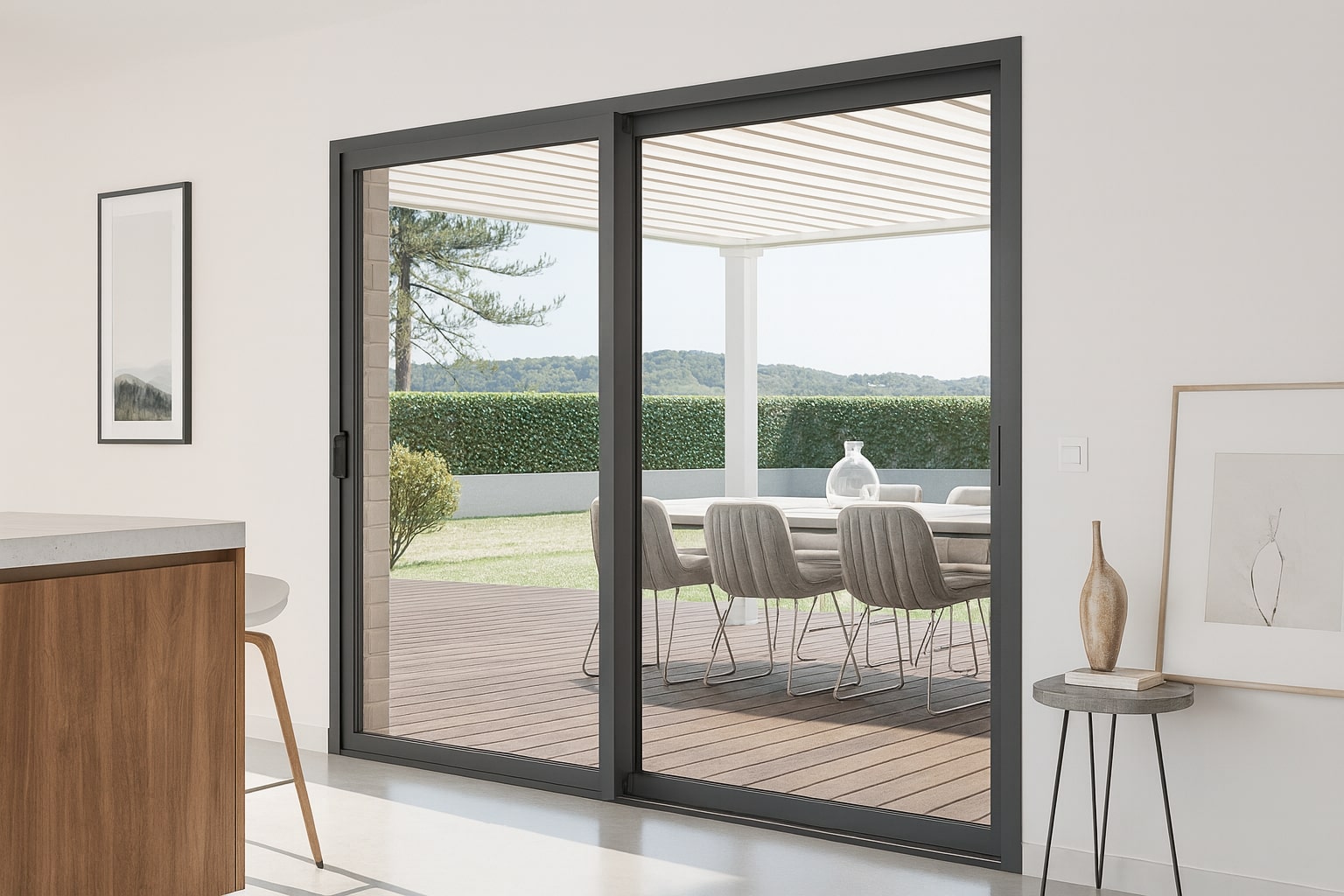 L’alu se distingue par ses profils fins, sa rigidité et la possibilité de grandes largeurs, tout en conservant une isolation maîtrisée grâce à la rupture de pont thermique.
